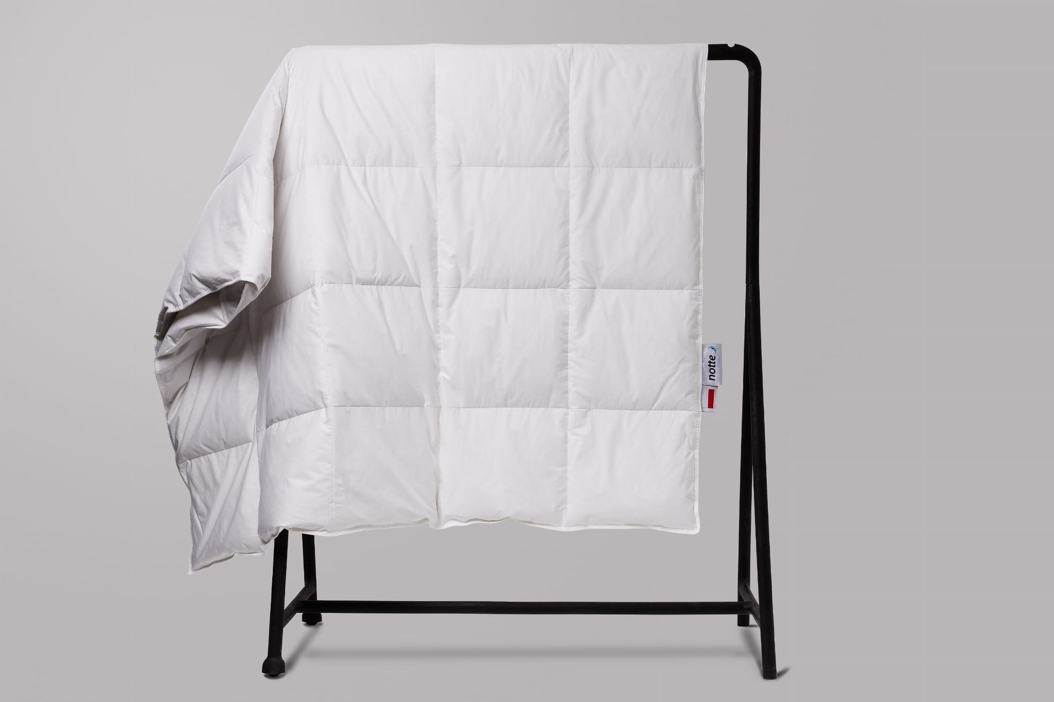 Każda kołdra pakowana jest w elegancką, przepuszczającą powietrze walizkę w szarym kolorze z białym logo Notte.