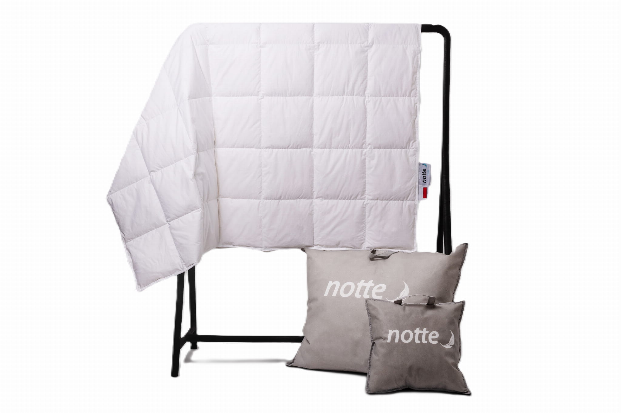 Każda kołdra pakowana jest w elegancką, przepuszczającą powietrze walizkę w szarym kolorze z białym logo Notte.