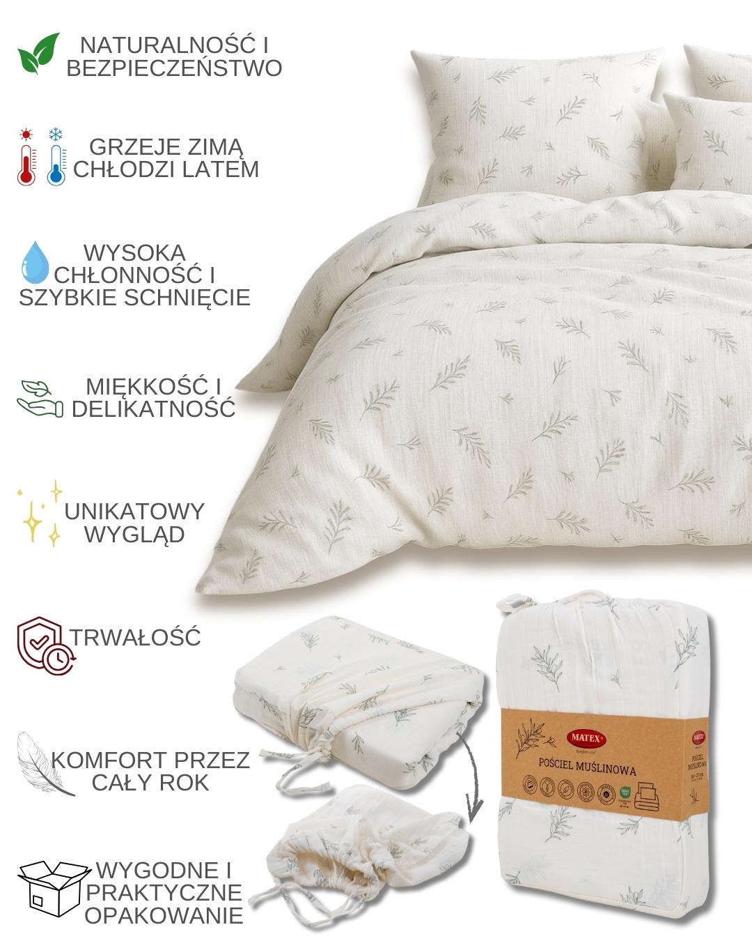 Muślinowa pościel zapewnia optymalną cyrkulację powietrza, dzięki czemu sprawdzi się zarówno latem, jak i zimą. Delikatna struktura tkaniny jest przyjazna dla skóry, również wrażliwej. Produkt posiada certyfikat Oeko-Tex, co gwarantuje bezpieczeństwo użytkowania i brak szkodliwych substancji.