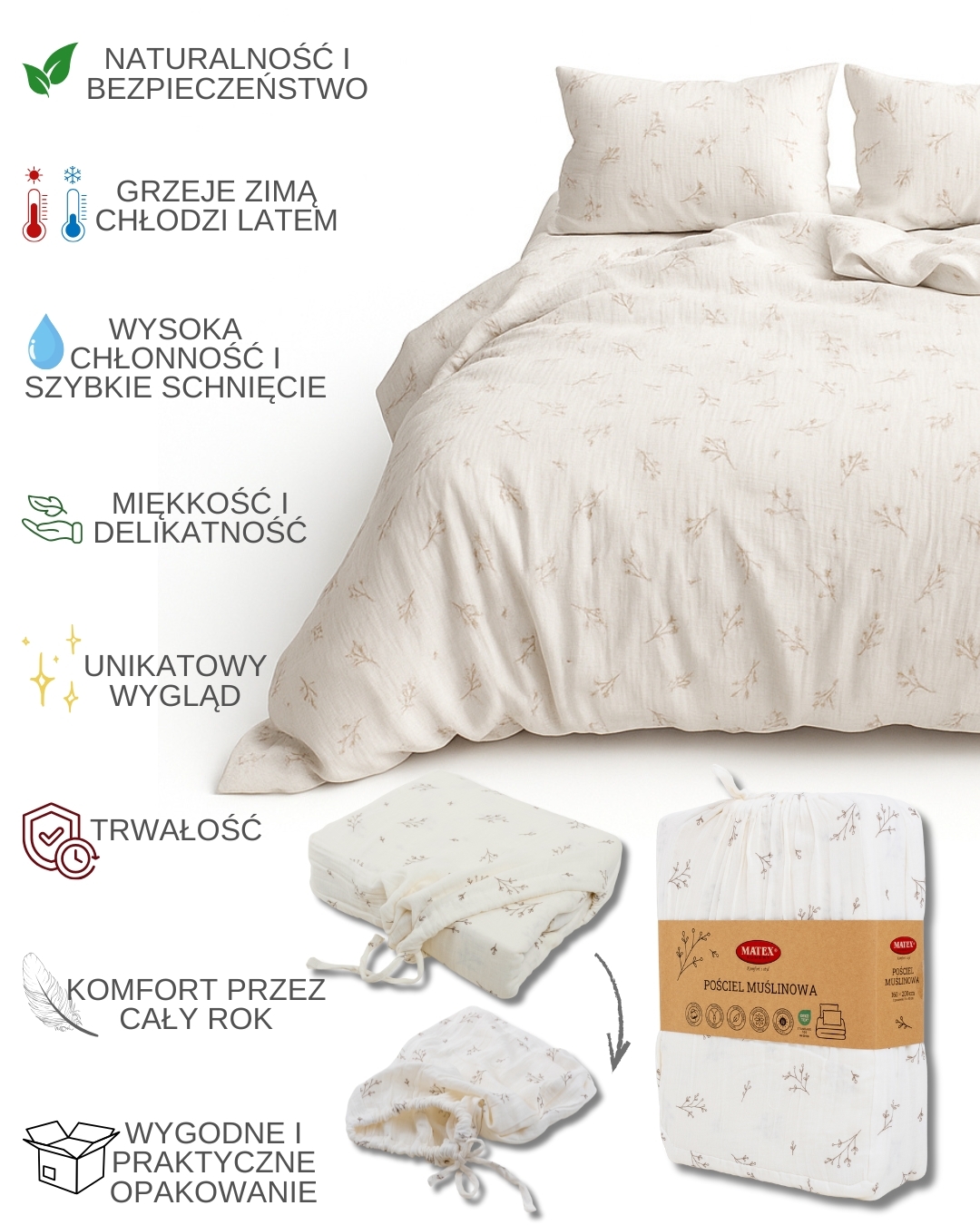 Muślin to tkanina, która idealnie sprawdza się przez cały rok. Latem delikatnie chłodzi i pozwala skórze oddychać, zimą natomiast przyjemnie otula, zapewniając komfort cieplny bez uczucia przegrzania.